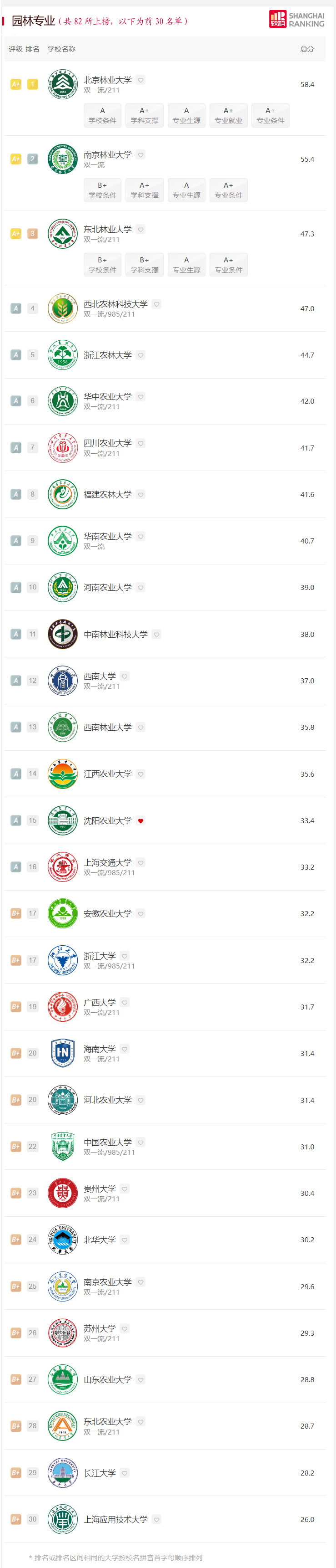 近日,软科发布2022年“中国大学专业排名”,我院园林专业排名15(前9%)上升1位,评级保持A;风景园林专业排名50(前23%)评级B;林学专业排名17(前35%)评级B。