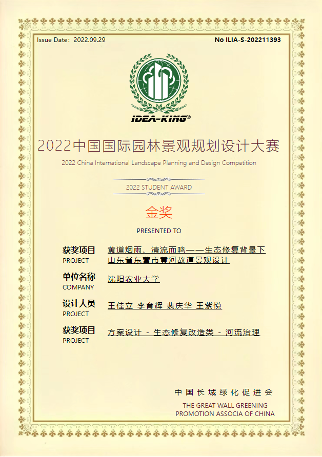 沈阳农业大学为第一完成单位,2021级风景园林专硕王佳立为第一完成人,杨立新副教授为第一指导教师的参赛作品《黄道烟雨、清流而鸣——生态修复背景下山东省东营市黄河故道景观设计》针对山东省东营市刁口河段黄河故道存在河道萎缩、土壤盐渍化和生态质量下降等问题,以营造烟雨朦胧、水清鸟鸣、生机盎然的自然景观为设计目标,基于生态规划原理,采用工程技术手段,试图通过适应自然环境的生态改造,建立天人合一人地和谐关系,保护当地生物多样性。该作品在高校组网络投票中排名第一,并最终获评金奖。