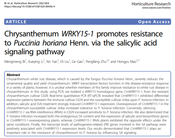 近日,Horticulture Research在线发表了YABO.COM亚搏毛洪玉副教授团队题为Chrysanthemum WRKY15-1 promotes resistance to Puccinia horiana Henn. via the salicylic acid signaling pathway的研究论文。文章中以课题组前期对菊花抗、感品种进行转录组测序获得的差异表达基因CmWRKY15-1为基础,本研究从菊花抗病品种‘C029’中分离得到CmWRKY15-1,发现其在抗、感品种中受病原菌诱导差异表达,并响应水杨酸(salicylicacid,SA)激素诱导。研究结果表明,CmWRKY15-1作为正调控转录因子,通过调节SA信号途径相关基因参与对菊花白色锈病的响应。该研究对于培育菊花抗病品种具有重要的理论和现实意义。