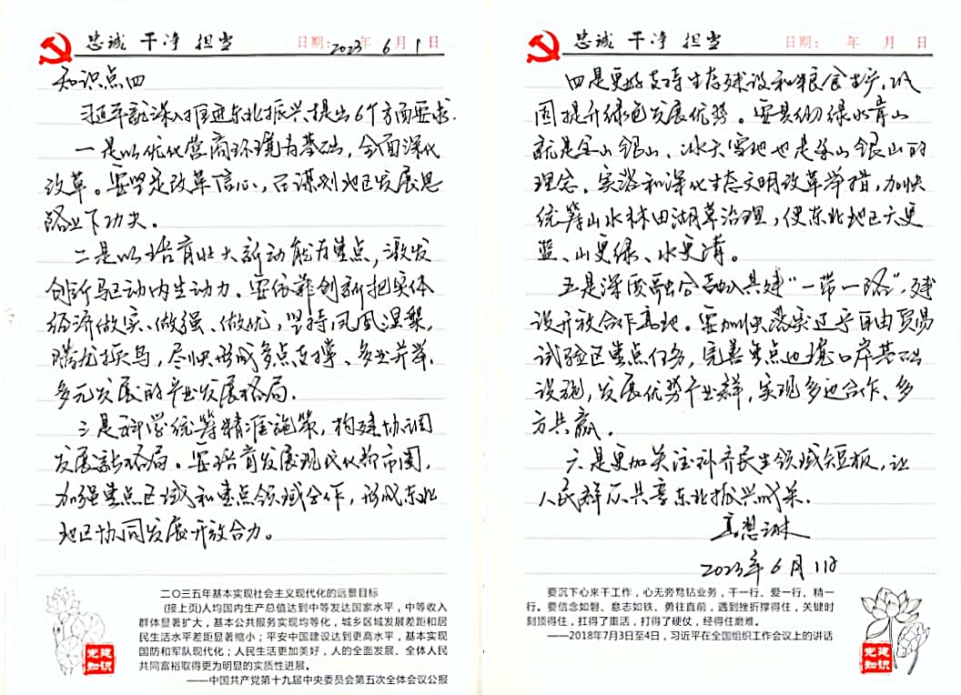 通过学习习近平总书记关于东北、辽宁振兴发展的重要讲话精神,让我明白振兴东北、振兴辽宁的重要性。全面振兴东北地区等老工业基地是国家既定战略,作为学生党员,我们要跟紧时代脚步,跟紧党中央号召,要讲诚信、懂规矩、守纪律、襟怀坦白、言行一致、心存敬畏、手握戒尺,对党忠诚。